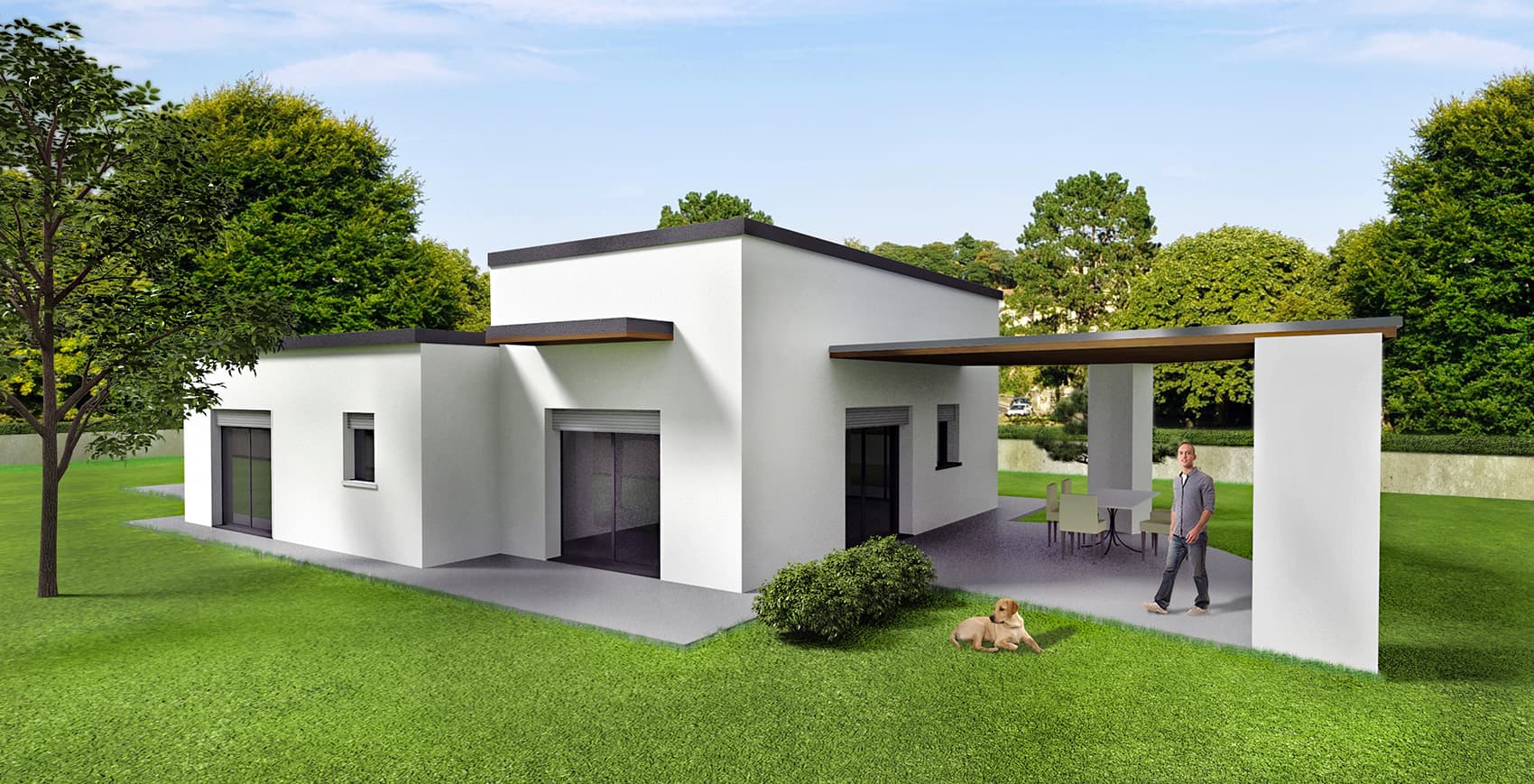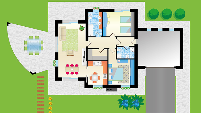 Genziana è un'abitazione in stile moderno dalle linee essenziali. Si sviluppa su un unico livello e si compone di due volumi centrali a cui è annessa un'ampia area esterna posta a bilanciare una simmetrica superficie destinata a garage. Ampie vetrate rendono la struttura leggera e luminosa. L'abitazione di oltre 150 m2 commerciali dispone di cucina separata, soggiorno, 2 camere, 2 bagni, garage coperto ed un ampio portico abitabile. |